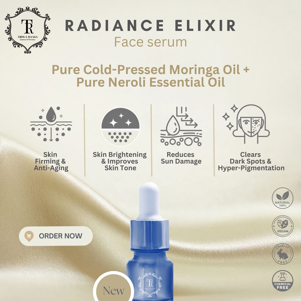 Introducing Radiance Elixir by Tirwa Raasa – a radiant revelation in skincare. Infused with 100% cold-pressed pure Moringa oil and the enchanting essence of Patchouli essential oil, this serum is your key to timeless beauty.